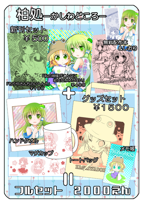 東方紅楼夢6に参加します! ********* スペースは「ろー36b」 です! 発行物は、コチラ(↓)を参考にして下さい~(^ω^)ノ 殆どコミトレと一緒なんですが、ポスカが無くなってメモ帳になっています。 あと、ラクガキを集めただけの無料配布本とかも紅楼夢で出します~(^▽^*) ちょっと見づらいかな、と思うので文字ででも書いておきますね; ●新刊セット ¥500 「私の神様がこんなに幼女なわけがない」 ¥400 諏訪子がリアル幼女になってしまう話 →sample sample(pixiv) 「もりやけのいへん!!」 ¥100 守矢一家のケモ化っぽい話でギャグ →sample(書店さんサンプルw) ●グッズセット ¥1500 →sample(写真) sample■■■ トートバッグ マグカップ ハンドタオル メモ帳 ●無料配布 ※どれかひとつでもご購入の方に両方お渡しいたします。 「なにこれただのらくがき本」 ※ジャンルごちゃまぜラクガキ本→sample(pixiv) フルカラーしおり(裏面1色) ●フルセット ¥2000 新刊セット+グッズセット+無料配布全て併せたセットです。 既刊以外をお求めの場合、このように伝えて下さいねっ^^ ********** 既刊 「SDP」 ¥300 早苗メインで色んなキャラが出てきます。 4コマギャグ。 「スキマでおジャマ☆」 ¥300 紫と霊夢でギャグ。 紫がスキマに詰まります。 上記2冊のサンプル→sample ********** ポスターお譲りします。 イベント会場にてPOPとして使用していたポスターを、もしご希望の方がおられたらお譲り致します。 以下の条件でも構わないと仰って下さる方はどうぞよろしくお願い致します~v ①テープ跡や折り目など、傷みがあり、状態は良くないです。 筒など、保護材にお入れしてのお渡しが出来ません。 それでも構わないと仰って下さる方。 ②紅楼夢当日、午後2時以降に先着により受付致します。 絵柄はご希望のものをお選び下さい。 ただ、会場で確認しての選択は出来ませんので、あらかじめ絵柄をご確認下さい><; ポスター絵柄はコチラです。 全てピクシブ画像です、すみません; ■ ■ ■ ■ ■ 紫と霊夢のは、2枚に分かれています。 ********** スケブについて 当日、時間があるようでしたらお受けしたいと考えておりますが、多忙の場合お断りしてしまう場合もあるかと思います、申し訳ありません><; 多分、午前中はお断りしてしまう可能性が高いかと…; ヒマそうにボケ~としていたら、よろしければ試しにお声を掛けてやって下さいw