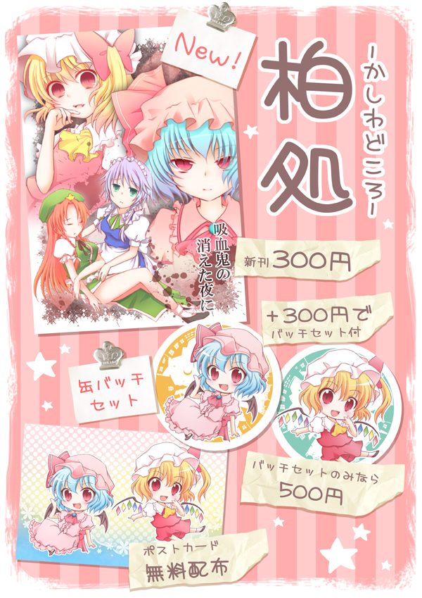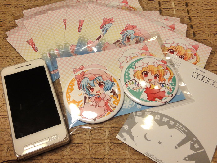おひさしぶりですー; えっと、今度の日曜日のこみトレの告知にやってまいりましたw 行かれる予定の方、よろしければ当スペースにもおたちよりください~v こちらが当日の発行物です↓ ●新刊+バッチセット(缶バッチ2種+ポストカード)=¥600 ●バッチセットのみ=¥500 といったかんじです。ややこしくてスミマセン><; 本当はバッチは無配にしたかったんですが、思ったよりかかっちゃった上に2種類あるとお渡しの仕方とかどうしよう??と悩んだ結果…こういった形にしました! でもホント、すごい大きいんですよー! こんなかんじです↓ いい比較対象がパッと見当たらなかったので、自分のケータイを横に置いちゃいましたw おっきくないですか!? お願いした製作所さんでいっちばん大きいサイズにしちゃいました☆ 是非是非見てやって欲しいですーv 新刊はコチラ!↓ 初の紅魔館本ですー! ギャグ&シリアスで、魔理沙がちょっと出てきます。 表紙にはいないですが、パチュリーもいますよー この本は、今のトコ書店さんでの委託はお願いしてないです。 するとしたら紅楼夢の頃かなーと。 あ、あと5月の例大祭で出した本もその時に全部出ちゃったので、今回のイベントに置いていません。すみませんー; 再版の予定はありませんが、再録をだしたならそのときには収録するつもりです。 当日は表紙絵のポスターを飾ってるので目印にしてくださいーv あと、そのポスターもしご希望の方いらっしゃったら差し上げますー! 当日の2時以降にお声を掛けてください。 サークル名が入っていたり、使用しているので痛んでいても構わない方…という条件付きになっちゃいますが; あと私の既刊「SDP」の表紙の早苗さんのポスターも同じくお譲りします! 絵柄はコチラ↓ あ!あと、前回のコミトレで配布したスカーレット姉妹のポスカが出てきたので、それも持って行きますね~ コレです↓ 台風が心配なカンジですが、皆さんお気をつけて!>< 晴れたら晴れたで熱中症にはご注意くださいね! インテックスの4号館はひたすら暑いってイメージです、個人的にw ではではー! もし何かありましたら、メールやツイッターなどでお気軽にどぞ~☆ 【追記】 もしモンハンのギルカ交換したいって方いらっしゃったら是非是非! すぐ起動できるようにしておきますので~ 並んでる方とかがいらっしゃらない時に限りますが…;